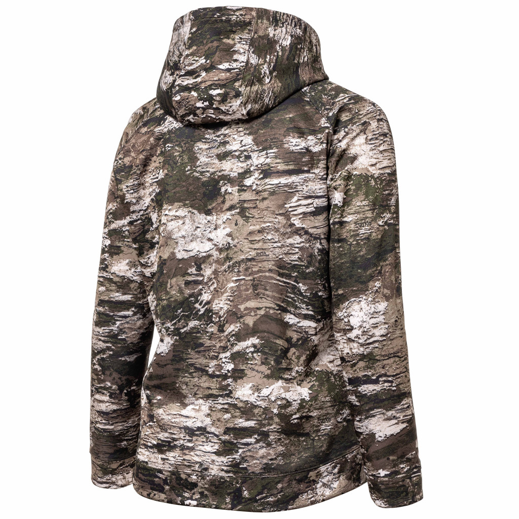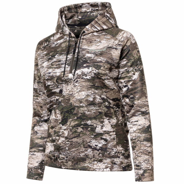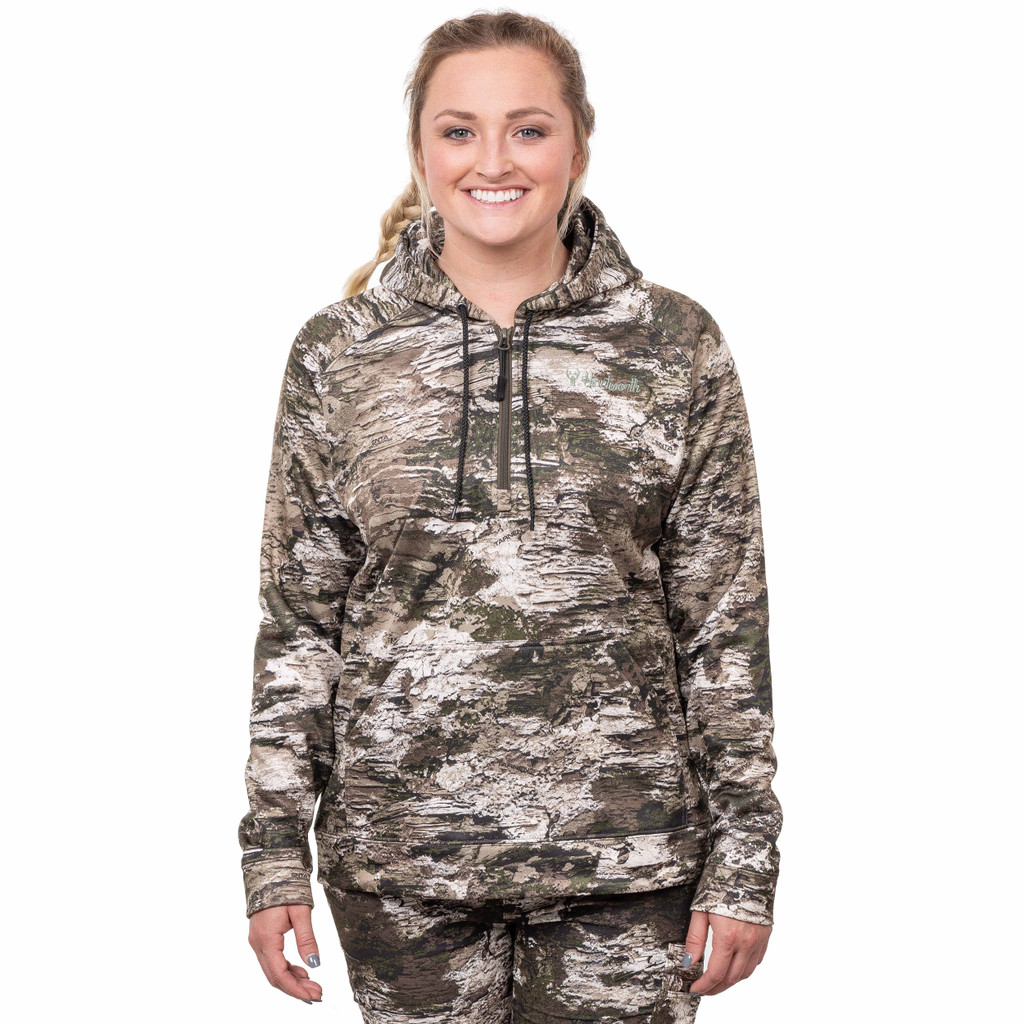 Der mittelschwere Damen Harrison Jagd-Kapuzenpullover in Tarnen ist aus einem seidig glatten, sanft aufgerauhten Performance-Fleece gefertigt, der sich angenehm warm anfühlt. Er wird schnell zu einem Ihrer Lieblingskapuzenpullover für die Jagd, den Aufenthalt im Camp oder einen Ausflug in die Stadt werden. Tragen Sie ihn allein oder als Zwischenschicht auf dem Ansitz.