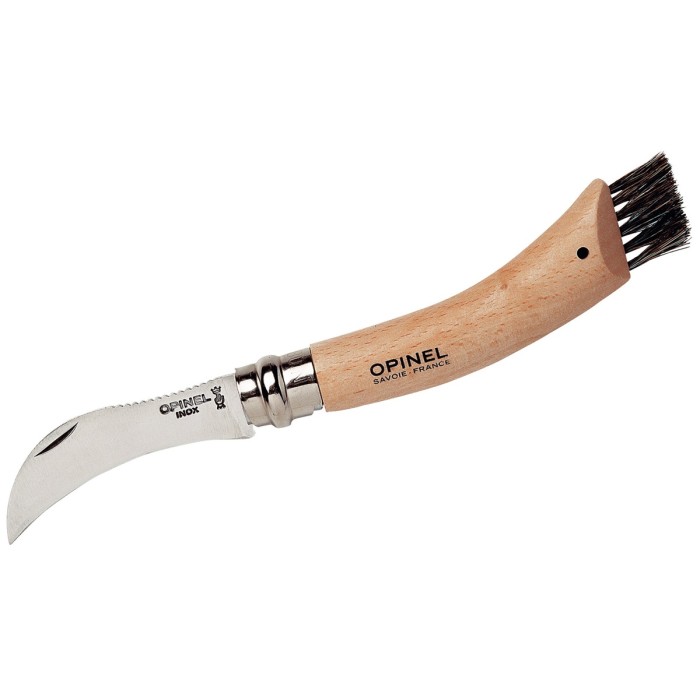 Das Opinel Pilzmesser ist ein ausgezeichnetes Klappmesser für Pilzsammler und -händler. Ein hervorragendes Geschenk für Pilzliebhaber! Eine feine, gebogene Klinge aus rostfreiem Sandvik-Stahl mit gezahntem Rücken erleichtert die Arbeit mit Pilzen. Am Ende des Griffteils, der aus naturfarbenem, lackiertem Buchenholz gefertigt ist, befindet sich eine Bürste aus Wildschweinborsten, mit der sich Erde und Schmutz mühelos von den Pilzen entfernen lassen.