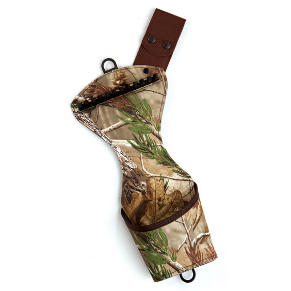 Beidhändig nutzbarer Hüftköcher, konzipiert zur sicheren Aufbewahrung von 5 Pfeilen mit Jagdspitzen während der Bewegung durch den Wald. Befestigung am Gürtel.