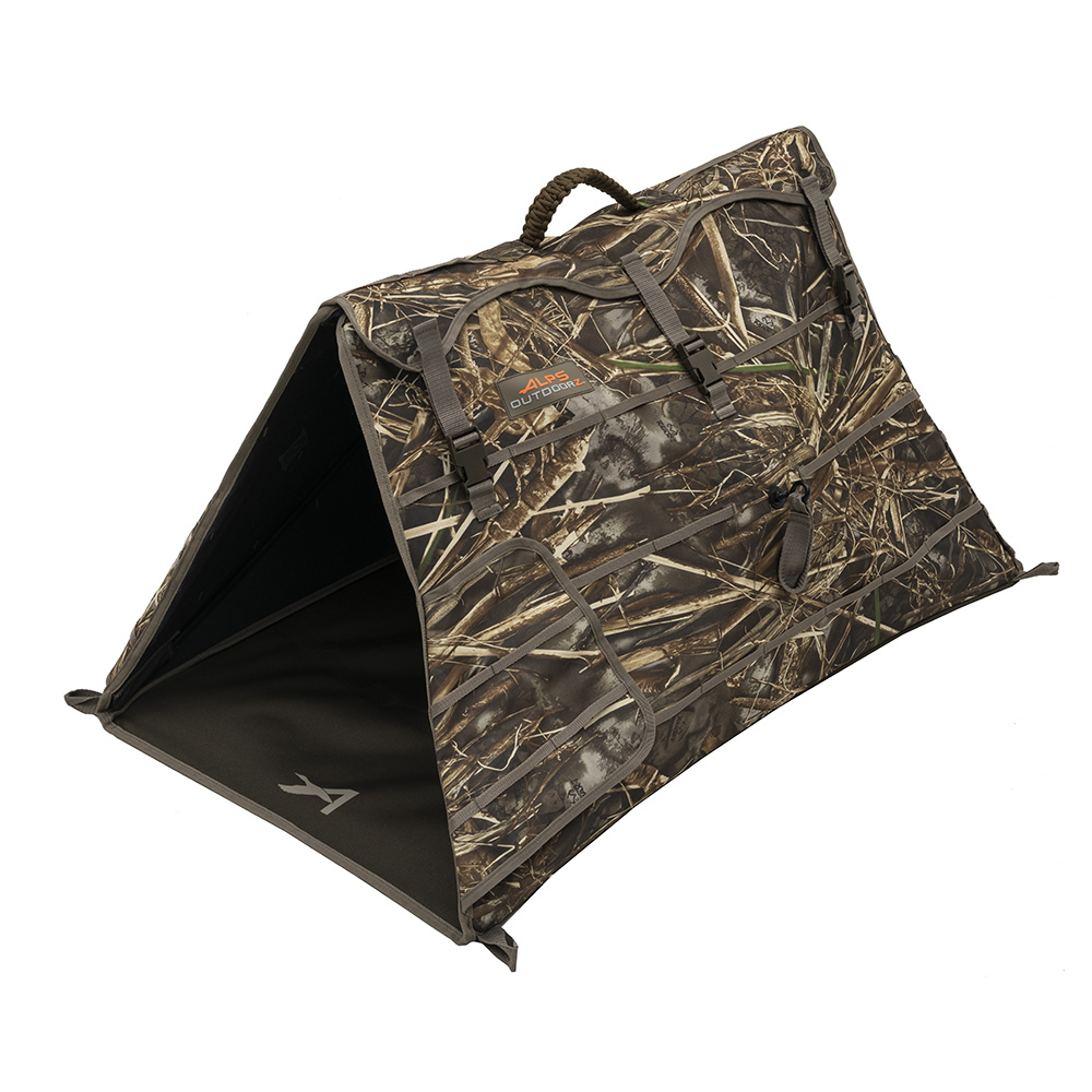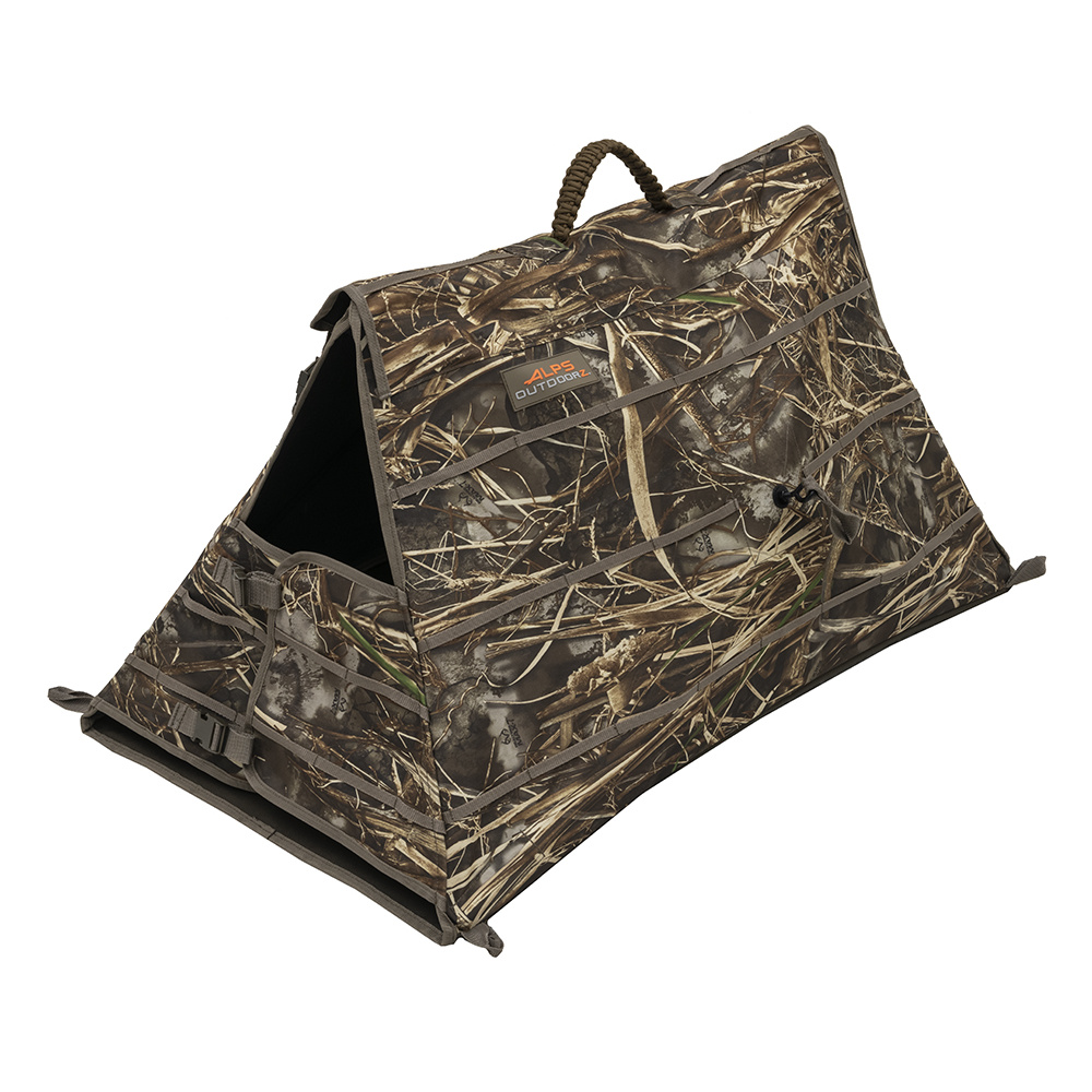 With its unique and quick-access design, the Alpha Dog Blind, is the most versatile and effective dog blind on the market. The Alpha Dog Blind provides your favorite hunting companion the comfort and concealment needed for a full day’s hunt in the harshest conditions. Using a unique aluminum hub design with engineered tips and pins, the Alpha Dog Blind offers quick and easy set-up in seconds. A tapered roof peak allows an unobstructed line of sight for your dog while keeping him concealed. Constructed of durable 600D polyester fabric with black-out backing, the triangular shape of the Alpha Dog Blind provides ultimate concealment from all angles. Meanwhile, the padded 900D polyester fabric floor provides durability and comfort for your partner. Magnetic dual-swing front doors and a dual-swing rear door with buckle closure provide quick and easy exit/entry options for retrieves. A paracord handle and included shoulder carry bag make for easy transport to and from the field. Stakes are included to keep the blind secure. With the addition of the Alpha Dog Blind to your hunting arsenal, your favorite hunting companion will get to experience the excellence and quality you have come to expect from ALPS OutdoorZ.