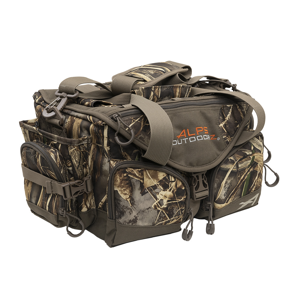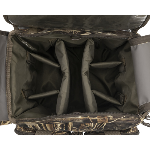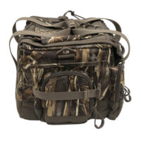 The Floating Deluxe Blind Bag has been designed with an array of convenient features, such as a removable interior dividers, a clear valuables pocket for your cell phone and other accessories, and a hard sunglasses case. The main compartment is constructed of non-absorbing, closed-cell foam and sealed with a waterproof membrane that will keep your gear dry when sitting in water or mud. The bag also includes a multitude of pockets to give you countless organization options, as well as a thermos & jacket sleeve on the top. The Floating Deluxe Blind Bag also features a padded carry handle and shoulder strap to make transporting your gear stress-free.