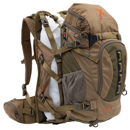 Whether you need a lashing frame only or a pack/frame combo the uniquely designed Hybrid X fits the bill. The highly versatile Hybrid X is a Western-inspired pack, offering all the conveniences of a day pack while providing the function of a meat hauler. This combination of an internal frame meat hauler with a detachable 2,750-cubic-inch top-load pack bag offers the ability to carry essentials for the hunt and haul meat out when the task is completed. The pack easily attaches to the frame by a series of compression straps or the pack bag can be removed from the dual-aluminum frame for better internal frame meat hauling capabilities. The frame also features a shelf and compressed wing-style pockets to accommodate small or large hauls. Constructed with heavy-duty fabrics with Hypalon reinforcement, the Hybrid X offers unmatched strength and durability in the field. A molded-foam suspension system and Lycra shoulder straps provide comfort and stability on treks across the most unforgiving terrain. The pack features a drop-down weapon pocket, perfect for hands-free carrying of your firearm or bow, while the waist belt provides additional pockets and accommodates a clip-style holster. The front pocket enters directly into the main compartment, allowing easy access to gear and essentials. A hydration pocket and port are included in the design, as is a rain cover for when the weather is less than favorable. Whether you are out for a quick trek or the entire day, the Hybrid X will provide every feature you need for a successful hunt.