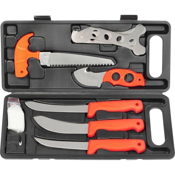 The knife set has everything you need to handle the game, at an affordable price. The knife set contains eight useful tools that make meat processing much easier. With the help of the set, the work steps of opening and gutting, skinning, cutting and cutting the carcass, as well as chopping and separating are possible efficiently. The handles of the tools are made of non-slip material and are clearly placed in the plastic case.