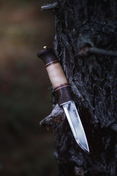 The full-length stick tang blade is made of triple laminated stainless steel. Sharpened with a traditional scandi grind and hand polished to a razor-sharp edge.