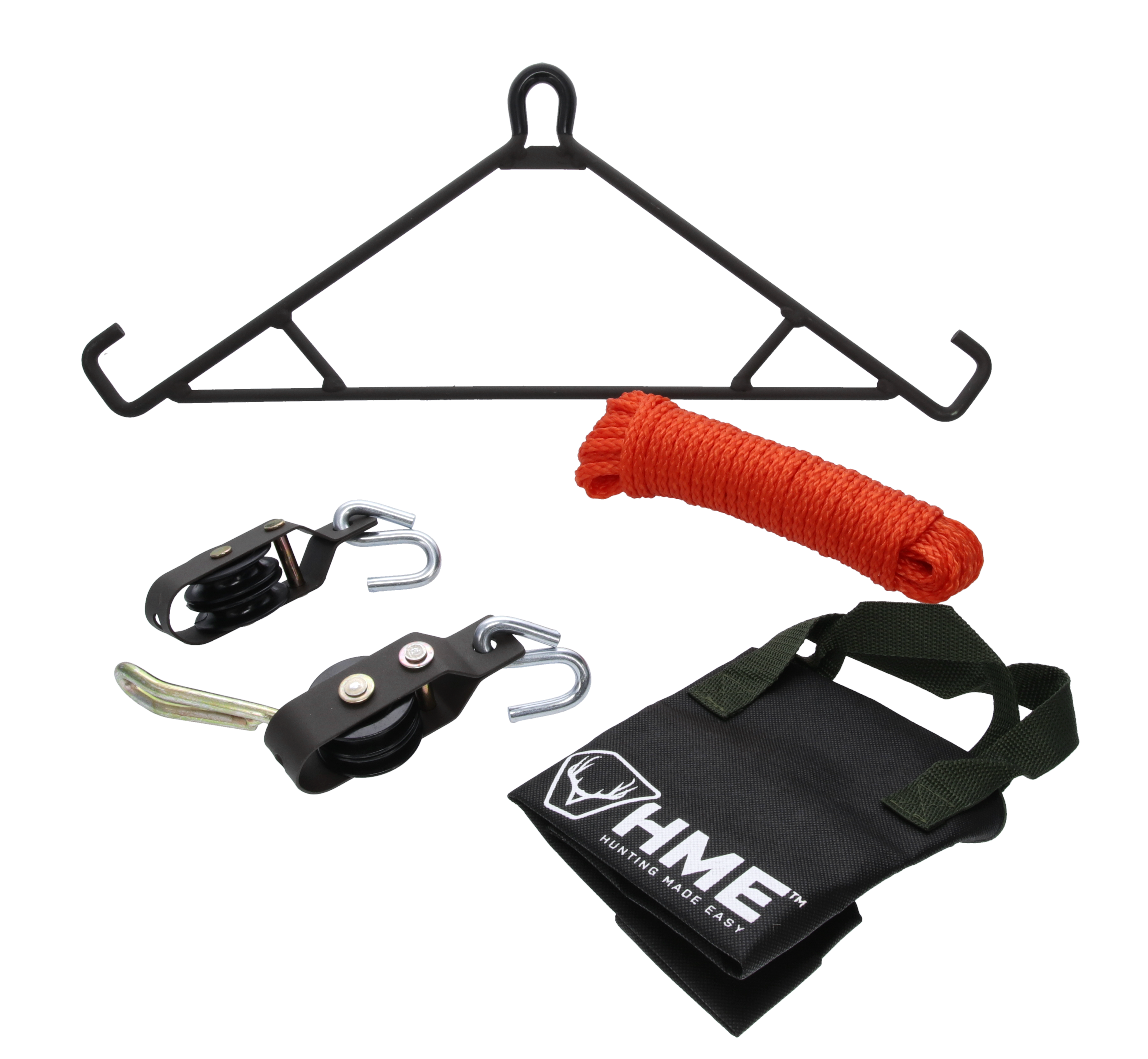 - Includes: Gambrel, Pulley system, rope, carrying bag