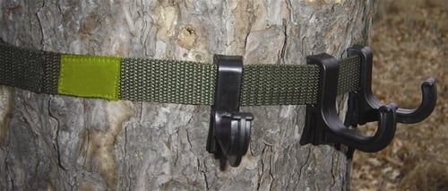 Securely mounts in seconds by simply wrapping around the tree, pushing the end of the strap through the cam buckle and pulling tight.