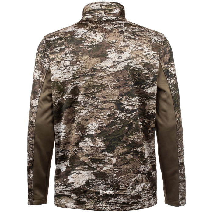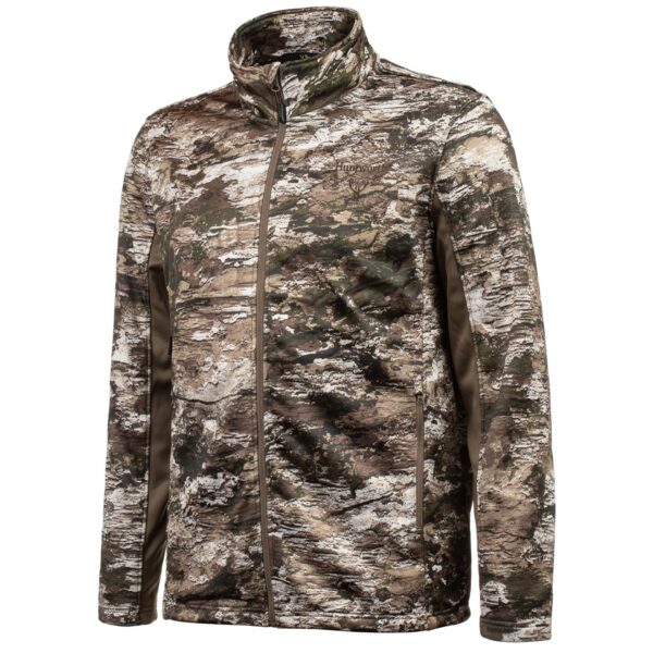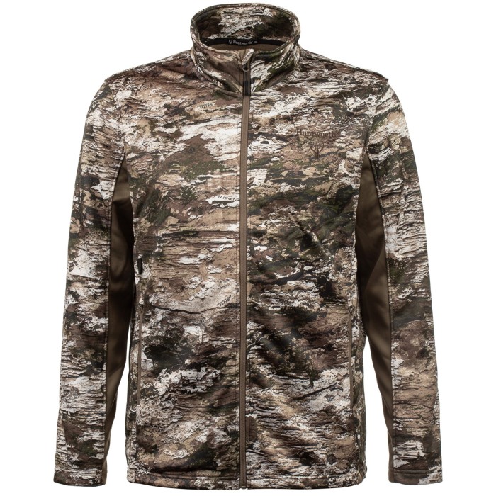 Our soft shell hunting jacket has the heat you need without the extra heft. The water-resistant, stretch polyester exterior is bonded to thick, anti-pill fleece, providing a double-layer design that will keep you warm and protected for the mid-season chill. The high stand collar and inner storm flat block bitter cold winds, while the DWR finish on the exterior fabric repels light snow and rain. Printed in versatile Tarnen® camo, this jacket provides the concealment you need to bag your buck. Keep your phone and other essentials close at hand in four large pockets—two zippered side pockets and two open pockets inside. The jacket is soft and flexible, with stealthily silent materials so you can sneak up on that buck. No matter what, you’ll be ready when he shows up.