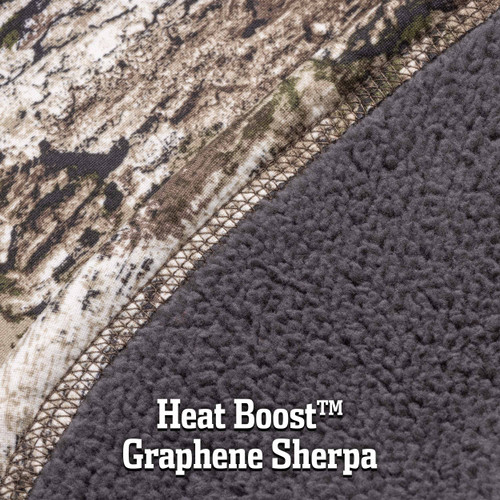 The hunting neck gaitor is constructed with a peached stretch jersey treated with a DWR finish that repels moisture. It is bonded to Heat Boost™ graphene sherpa, a new generation of enhanced fabrics. The stretch nature of the bonded material makes the gaitor easy to put and take off. Tuck the extended front piece into your jacket to lock in the heat and seal out the cold. This gaitor will get you through late season hunts in comfort.