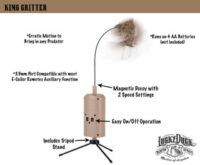 The King Critter is the ultimate predator decoy that was built to handle extreme conditions. With erratic motion from the magnetic decoy, it is bound to bring in any predator. The King Critter has 2 speed settings for the decoy, and includes a tripod stand perfect for any terrain. There is also a 3.5mm port compatible with most e-caller remotes with auxiliary function. Runs on 4 AA batteries (not included).