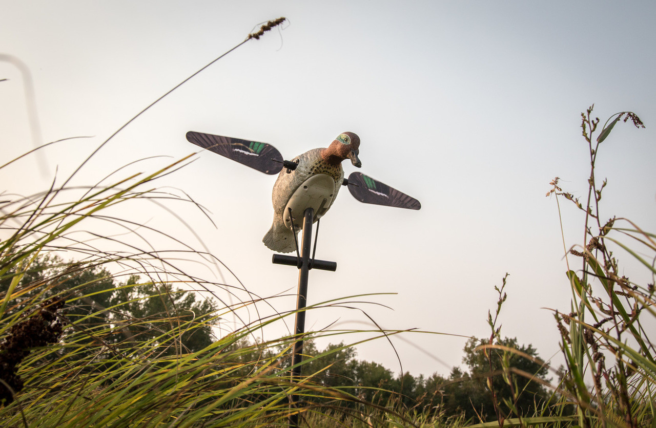 The Lucky Teal HD is a full sized spinning wing decoy with exceptional detail. Made of durable EVA plastic that resists cracking and holds paint adhesion for even the toughest waterfowler. Our chest mount with bungee makes this decoy hassle free and mobile. The Green Wing Teal includes a 3 piece 42″ stake and magnetic wings with life-like print. Decoy runs on 4 AA batteries (not included) and will run for 12-14 hours. HD remote ready.