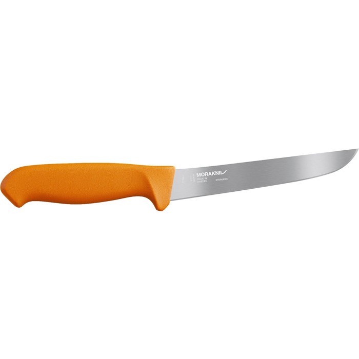 The Morakniv Hunting Straight Boning butcher knife has a straight, stiff, stainless steel blade. The attention-colored plastic handle is ergonomically designed, which facilitates easy and precise work. The knife is easy to clean.