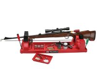 The MTM Gun Vise was designed to accommodate a wide array of firearms for gun cleaning, maintenance, or gunsmithing, and is for rifles and shotguns. All firearm touch points are rubberized to protect your guns finish. The second fork behind the clamp is for cleaning guns, so that they will have proper angle for cleaning. The 11 compartments in the base can be used for separating gun components or anything you choose. 21 screw driver bit holders, molded to the unit, are as easily suited for jags and brushes as they are bits. Made of rugged, chemical and solvent resistant polypropylene plastic.