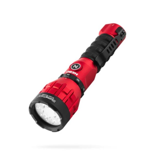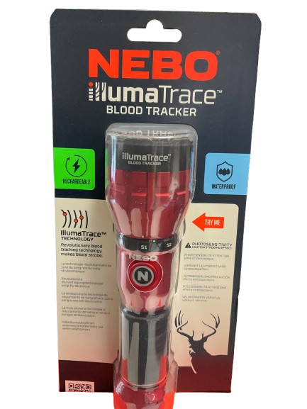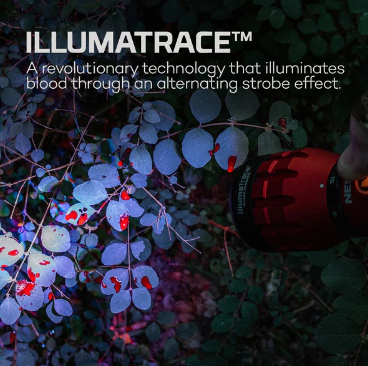 A downed animal should be a found animal. Boost your success rate finding the final resting spot of big game equipped with the NEBO® IllumaTrace™ Blood Tracker Flashlight. Patent-pending technology revolutionizes blood-trail detection with alternating strobes that enhance blood visibility against all terrains and backgrounds, illuminating the path to your trophy. Swiftly switch between white light for general path illumination and the precision of a specialized blood-tracking mode. Mode selector dial allows quick startup in your chosen mode. Select between 3 blood-tracking strobe rates to best match your visual preference and the hunting conditions. Boasting a remarkable range of up to 262 feet, the Illumatrace Blood Tracker thrives in both open fields and dense woodlands. This USB-C rechargeable device with 4000mAh lithium-ion battery boasts waterproof, impact-resistant, and lightweight aluminum frame construction. NEBO IllumaTrace blood-tracker flashlight includes detachable lanyard, removable belt clip, and USB-A to USB-C cable. Light modes: White (170 lumens, 2.5 hr. run time, 80m distance); IllumaTrace Blood Tracker (150 lumens, 3 hour run time, 75m distance). 7.48″L x 2.12″W x 2.12″H. Weight: .84 lb.
