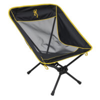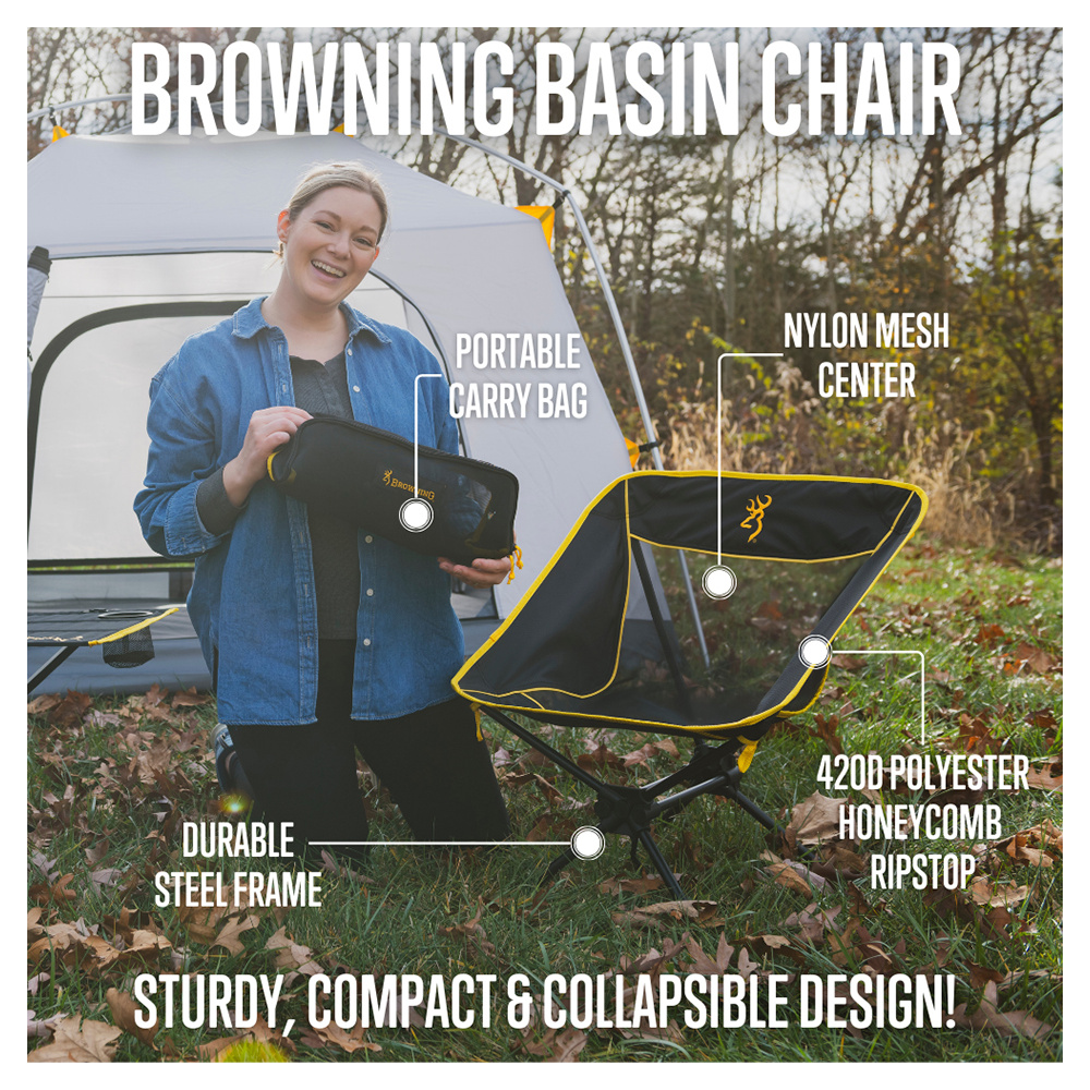 Browning Camping Basin-stol kan tas med på alla äventyr. Basin väger under 2,3 kg och packas i den medföljande bärväskan som är 38 cm L x 13 cm B x 13 cm H. Den robusta pulverlackerade stålramen är sammanfogad med en elastisk lina för en snabb och problemfri installation. Den medföljande bärväskan kan också fästas på stolen och fungera som en tillbehörsficka med dragkedja.