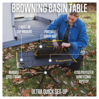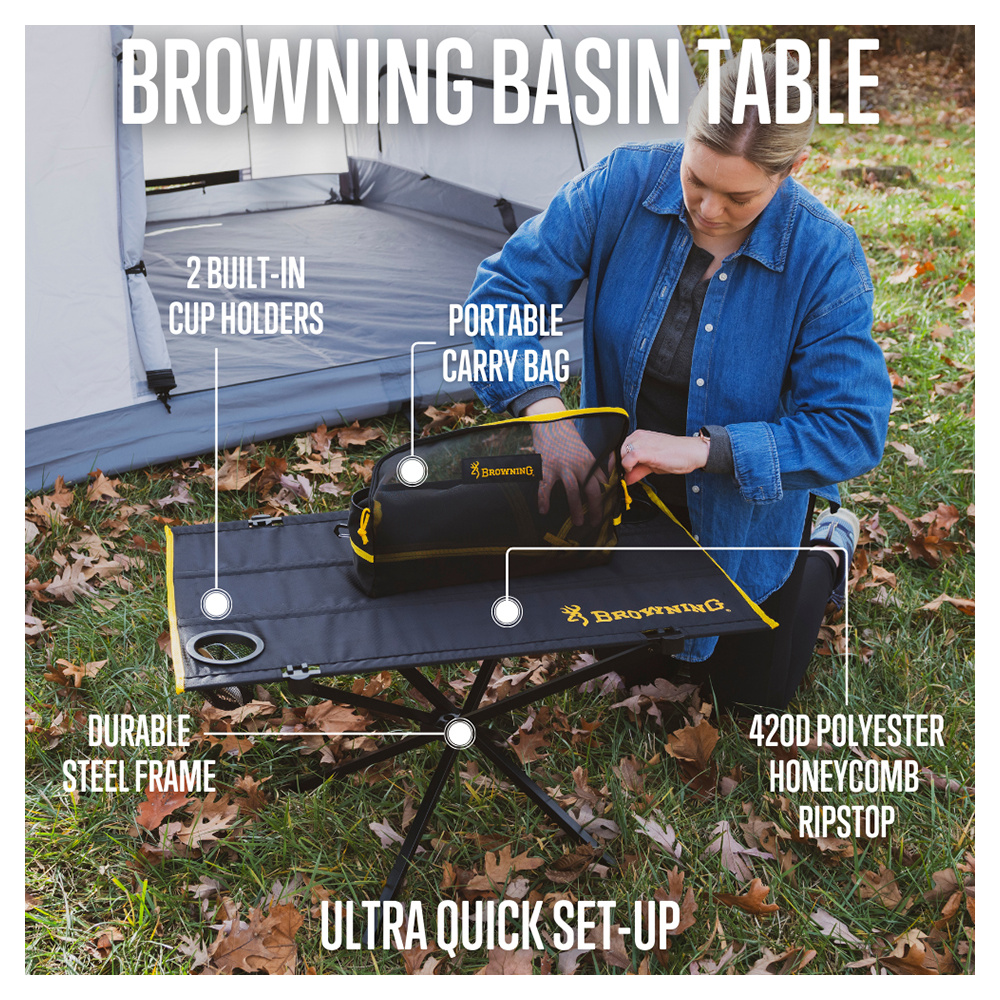 Var aldrig utan ett bord, tack vare tvättställsbordet. Dess slitstarka stålram sätts upp snabbt med sin hopfällbara navdesign. Dubbla inbyggda mugghållare säkerställer att dina drycker inte spills. Förstärkningar i ovansidans 420D polyester honeycomb ripstop-tyg håller ytan spänd. Tvättställsbordet fälls ihop snabbt och förvaras litet.